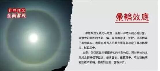 【知识拓展】Halo Effect晕轮效应又称“光环效应”,属于心理学范畴,是指当认知者对一个人的某种特征形成好或坏的印象后,他还倾向于据此推论该人其他方面的特征。本质上是一种以偏概全的认知上的偏误。晕轮效应愈来愈多地被应用在企业管理上,其对组织管理的负面影响主要是体现在各种组织决策上。