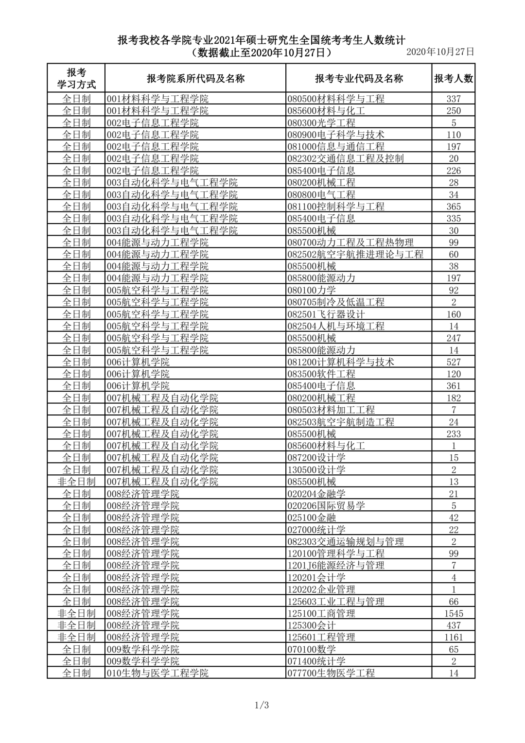截止2020年10月27日,报考北京航空航天大学2021年硕士研究生招生考试全国统考报名人数统计共计15267人。