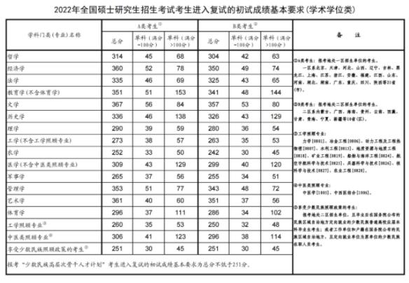 1.除“退役大学生士兵”专项计划考生外,初试成绩(总分、单科)必须达到《2022年全国硕士研究生招生考试考生进入复试的初试成绩基本要求》中A类考生的分数要求;招生单位根据本单位实际情况确定各学科(专业)进入复试的一志愿考生初试分数要求,同一招生单位同一专业非全日制与全日制必须划定同一分数线。