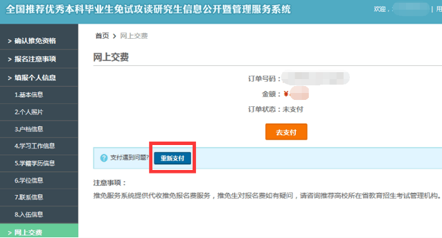 (4)网上支付报名费。推免生在报名时需要网上缴纳报名费,其中天津市、云南省推免生在确认接受待录取通知时进行网上支付